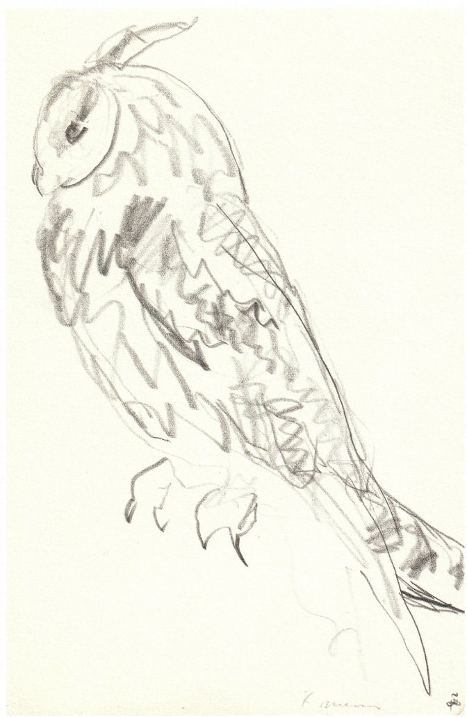 Dessin de Robert Hainard – Moyen-duc (Hibou moyen-duc – Asio otus) Genève 30 juin 1955, croquis - Dessin extrait de « Les oiseaux de Robert Hainard » – les rapaces nocturnes, Marie Madeleine Defago Paroz, Fondation Hainard